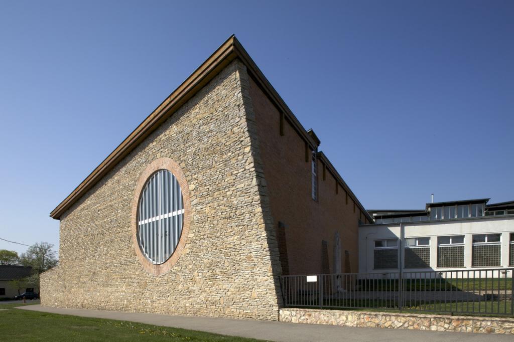 Az épület látszótégla burkolatú, kivéve az előbb említett oromfalat és kerítést, amelyek terméskőből készültek. A ház laposhajlású tetője fémlemez fedésű. A medenceterek fölötti tető egy egyszerű szerkesztésű ragasztott fa főtartókból álló szerkezet.