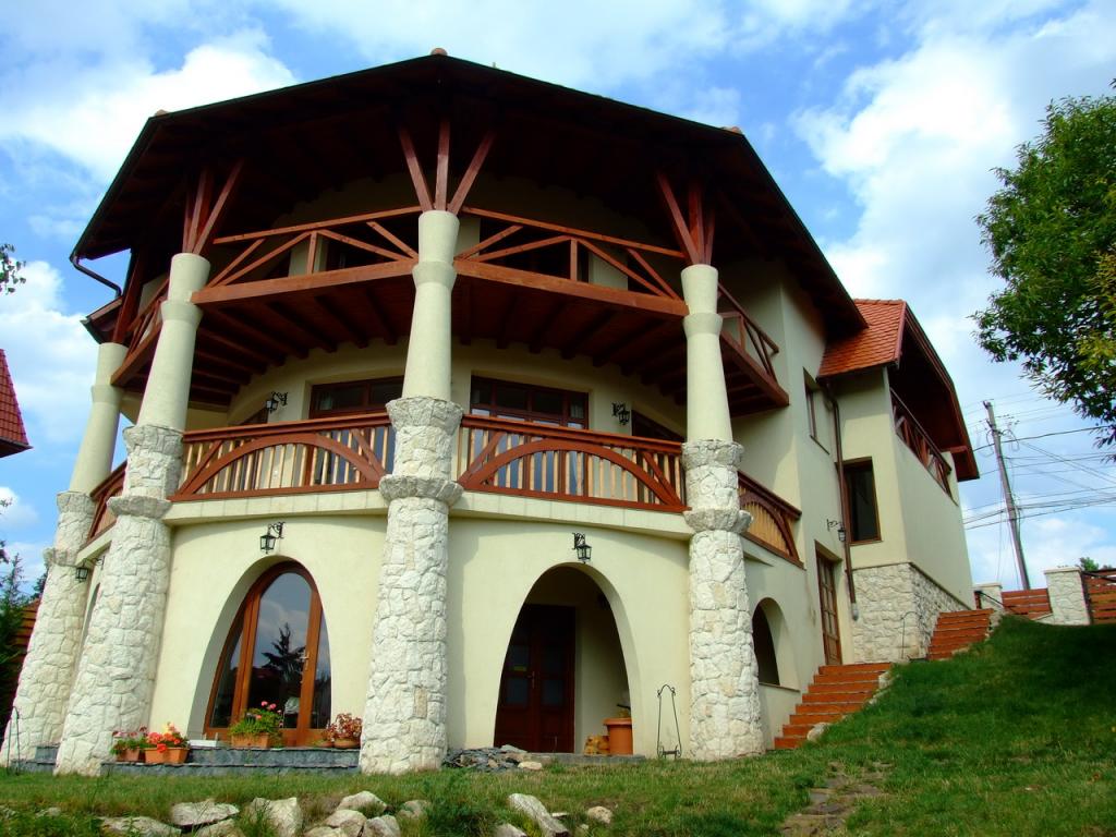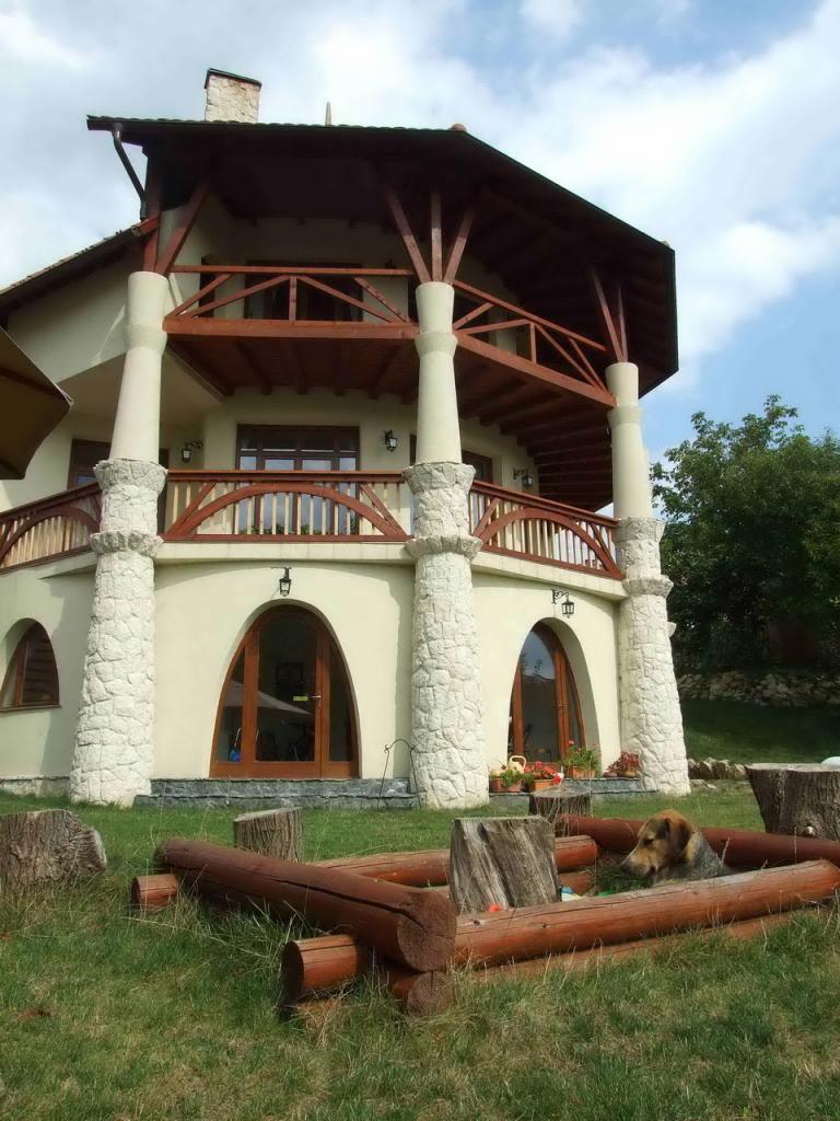 helyezete teszi sajátossá és a padlásteret megvilágitó nyújtott trapéz alakú ,vissaugró falrészbe helyezett ablak.A ház belső térelosztása a közlekedő vizszintes valamint a nappali központi oszlopának függőleges tengelyére szervezett ami meglehetősen tömör kifejezést kölcsönöz a háznak ezt hansúlyozzák a sudarasodó vistai kővel burkolt oszlopok is. A terasz körbefut több szinten a nappali illetve a társalgó tengelye körül , a kitáruló völgy, a látvány szerves részévé válik.A hatalmas kert nem kis erőfeszitéssel Dávid Zoltán kertész munkájával szelidült barátságos pihenő, játszó -térré.