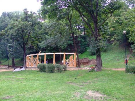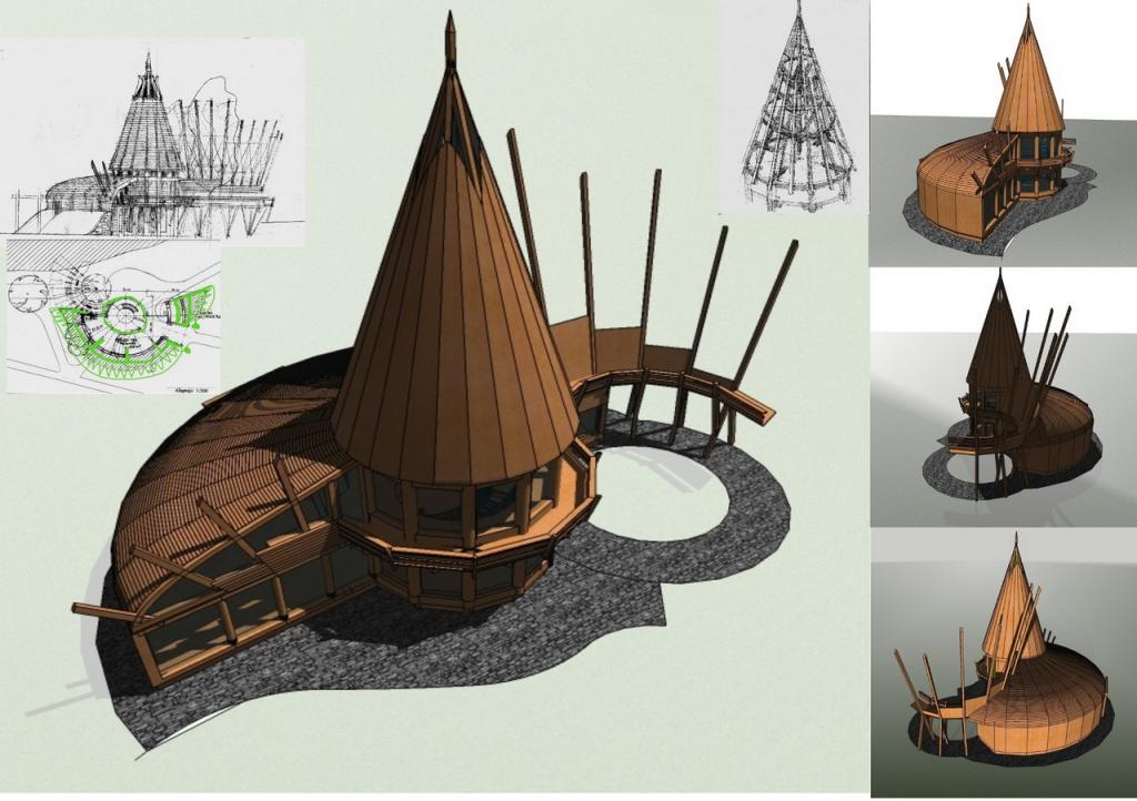 ''A kiállitó terem alapformáját egy kiforduló torony alkotja, szögét megtarva a kúpfelület kibomlik és átfordul, felfele nyitott forditott kúpfelületek keletkeznek. A felületeket alkotó gerendák a földről indulnak és egy hidszerkezetet alkotnak . Erre támaszkodik az emeleten induló galéria ami átvezet a kiállitó térből a domboldalon épitett instalációkhoz, egy iv mentén a park talán egyetlen nyirfája körül. A toronyban lévő lépcső visz fel az emeletre . A tetőt alkotó szarúfák a torony körül mindkét oldalon zsalus deszkaburkolatot kapnak az udvar körül csak a magasságuk egyharmadáig lesznek burkolva, a belső udvarban vetitésre is alkalmas felületet hozva létre. A gőmbsüveg szerkezetét ragasztott tartók alkotják kívűl belül deszkaburkolattal közötte hő és vizszigtelés.''-Részlet a pályázati műleirásból. A 2007-es rendezvényekre tervezett épitkezés előbb anyagi támogatás hiánya majd a telek tulajdonjogi helyzete miatt elakadt .Amennyiben a polgármesteri hivatal támogatja, lesz rá esély hogy folytatódjon .A szebenieknek rendszeres kulturális jelenlétet biztosithatna kiállitások, előadások, állandó helyszineként.